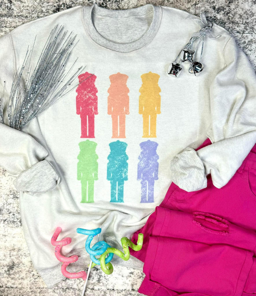 Inside out is all the rage. These colorful nutcrackers will be on the fleece side of a traditional fitting sweatshirt.
