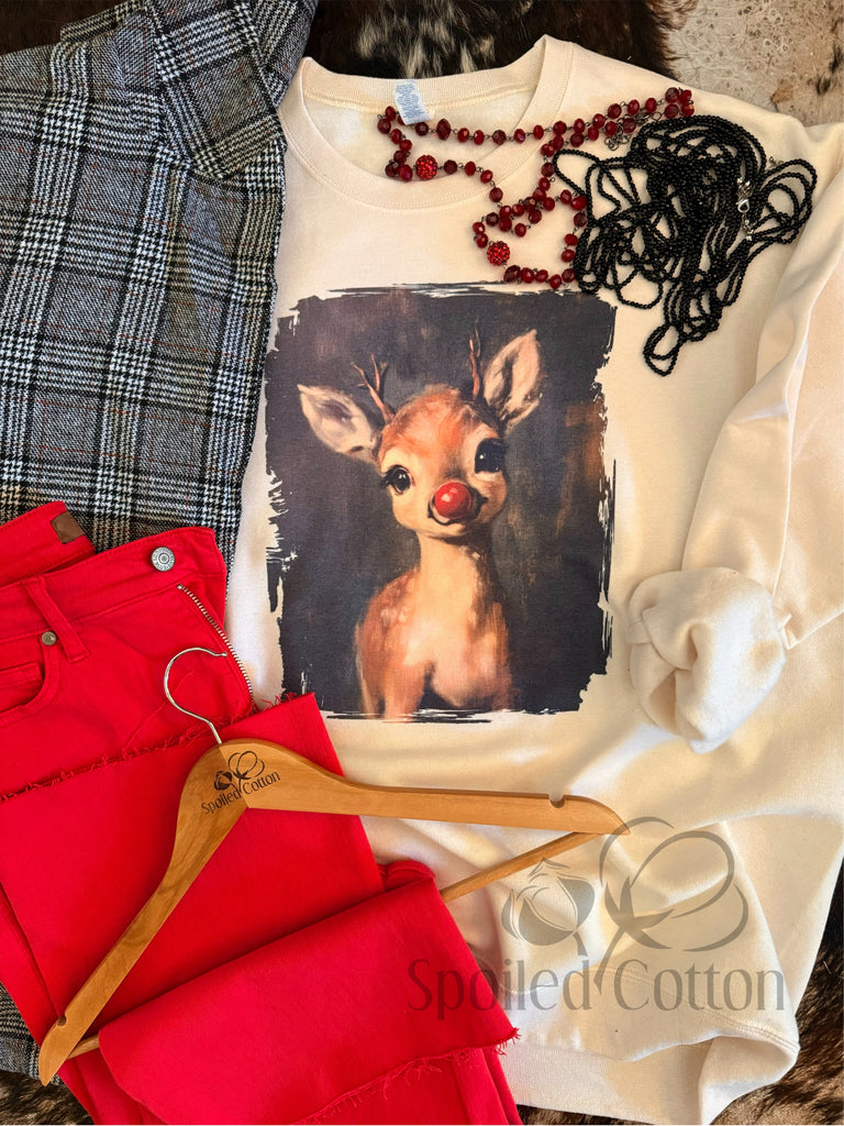 Red-nosed Reindeer on a cream-colored traditional sweatshirt. Pair with your favorite overcoat and red pants for a great holiday look.