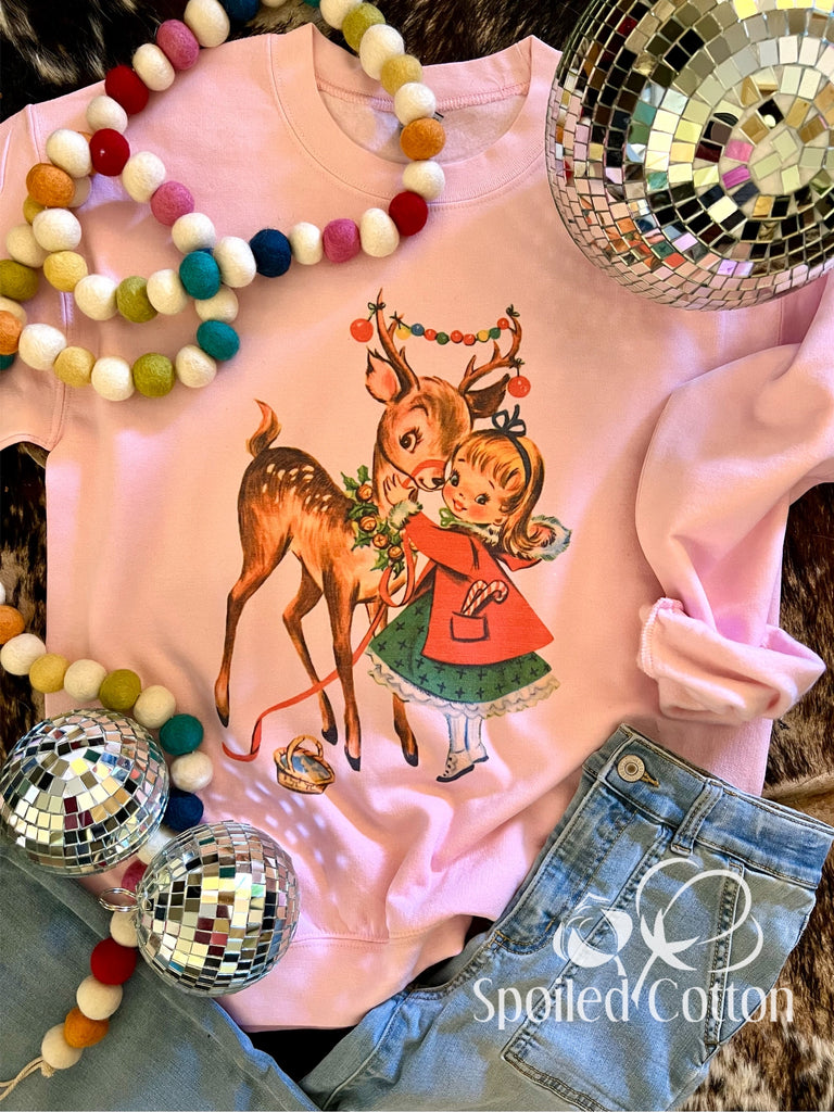 Vintage Christmas girl on a gorgeous bubblegum pink crew sweatshirt or tee.